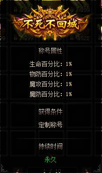 二、玩家累计充值(活动3天累计)达到30000RMB,可以自己选四至六个字-带特效定制称号,全属性增加2%。(定制称号在活动结束后统一提交制作,延后发放;活动期间,每个玩家仅能定制一个2%称号)